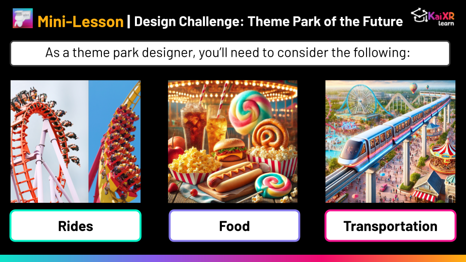 Welcome, Imagineers! It’s 2050, and Kai XR Innovations needs your help to design the ultimate futuristic theme park. Imagine thrilling rides, out-of-this-world food and entertainment, and high-tech transportation to wow visitors. Click Toolkit to find items and drag and drop them to build your theme park.
